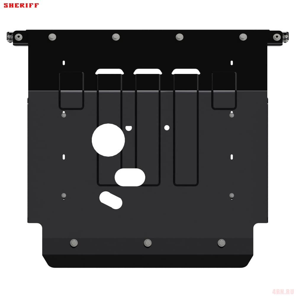 Защита картера Sheriff нужна для сохранности узлов и агрегатов, находящихся на днище авто. Она надежно защитит двигательный отсек вашей машины от повреждений. Также она защищает моторный отсек от влаги, грязи, и предусматривает наличие металлических крыльев, которые выполняют функцию пыльника.