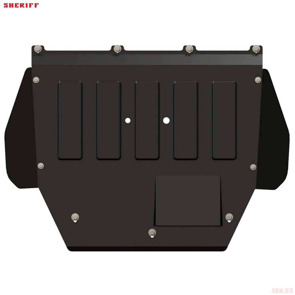 Защита картера Sheriff нужна для сохранности узлов и агрегатов, находящихся на днище авто. Она надежно защитит двигательный отсек вашей машины от повреждений. Также она защищает моторный отсек от влаги, грязи, и предусматривает наличие металлических крыльев, которые выполняют функцию пыльника.