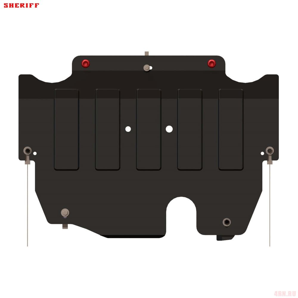 Защита картера Sheriff нужна для сохранности узлов и агрегатов, находящихся на днище авто. Она надежно защитит двигательный отсек вашей машины от повреждений. Также она защищает моторный отсек от влаги, грязи, и предусматривает наличие металлических крыльев, которые выполняют функцию пыльника.