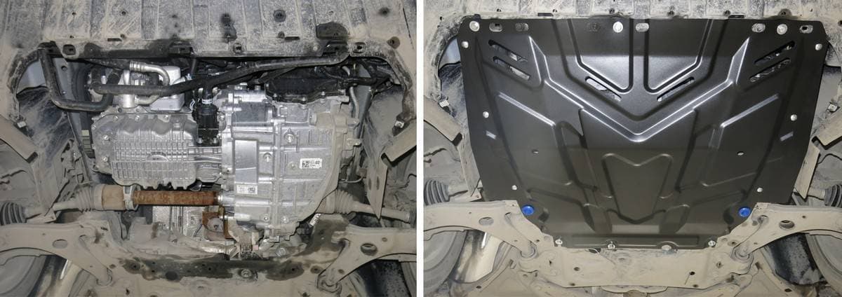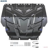 Порошковое окрашивание гарантирует долгий срок службы. А глубокий штамп увеличивает жесткость до 2,5 раз. Также имеется утопленный крепеж для предотвращения срывов. Качественная покраска защиты картера выдерживает 720 часов соляного тумана. Толщина изделия составляет 2-6 мм. Подштамповка в местах крепления предохраняет крепеж от срезания. Деталь спроектирована индивидуально для вашего автомобиля, что позволяет устанавливать ее в штатные места без доработки кузова за 10 мин.