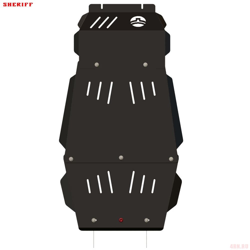 Защита картера Sheriff нужна для сохранности узлов и агрегатов, находящихся на днище авто. Она надежно защитит двигательный отсек вашей машины от повреждений. Также она защищает моторный отсек от влаги, грязи, и предусматривает наличие металлических крыльев, которые выполняют функцию пыльника.