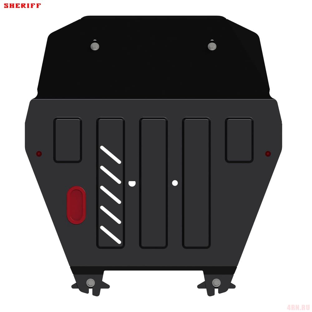 Защита картера Sheriff нужна для сохранности узлов и агрегатов, находящихся на днище авто. Она надежно защитит двигательный отсек вашей машины от повреждений. Также она защищает моторный отсек от влаги, грязи, и предусматривает наличие металлических крыльев, которые выполняют функцию пыльника.