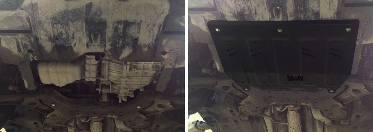 Порошковое окрашивание гарантирует долгий срок службы. А глубокий штамп увеличивает жесткость до 2,5 раз. Также имеется утопленный крепеж для предотвращения срывов. Качественная покраска защиты картера выдерживает 720 часов соляного тумана. Толщина изделия составляет 2-6 мм. Подштамповка в местах крепления предохраняет крепеж от срезания. Деталь спроектирована индивидуально для вашего автомобиля, что позволяет устанавливать ее в штатные места без доработки кузова за 10 мин.