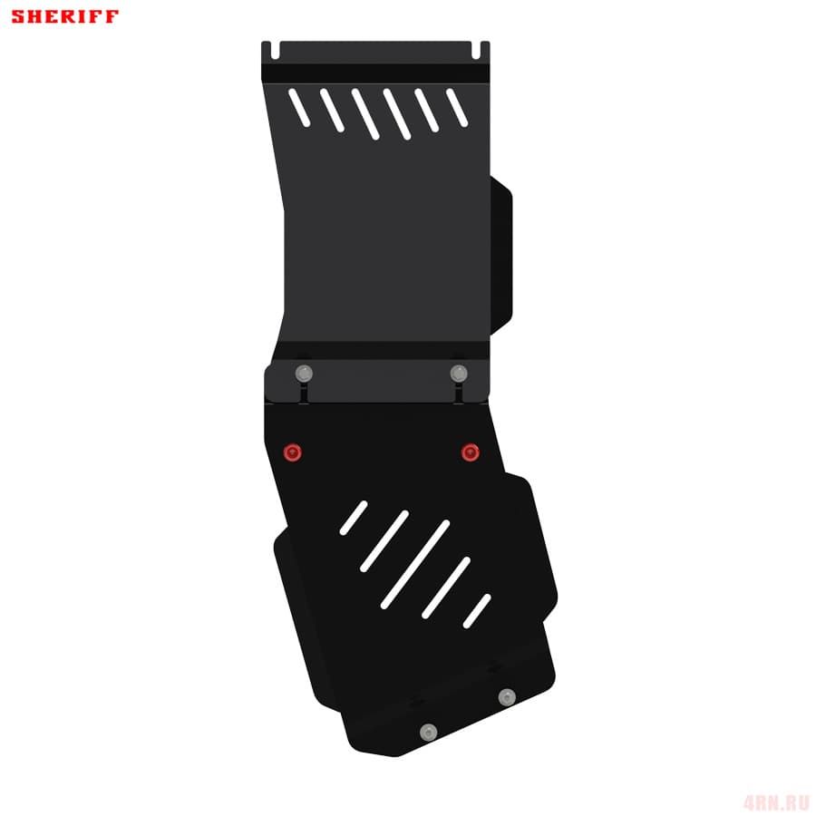 Защита картера Sheriff нужна для сохранности узлов и агрегатов, находящихся на днище авто. Она надежно защитит двигательный отсек вашей машины от повреждений. Также она защищает моторный отсек от влаги, грязи, и предусматривает наличие металлических крыльев, которые выполняют функцию пыльника.