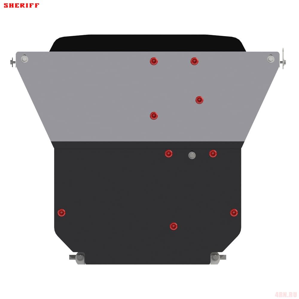 Защита картера Sheriff нужна для сохранности узлов и агрегатов, находящихся на днище авто. Она надежно защитит двигательный отсек вашей машины от повреждений. Также она защищает моторный отсек от влаги, грязи, и предусматривает наличие металлических крыльев, которые выполняют функцию пыльника.