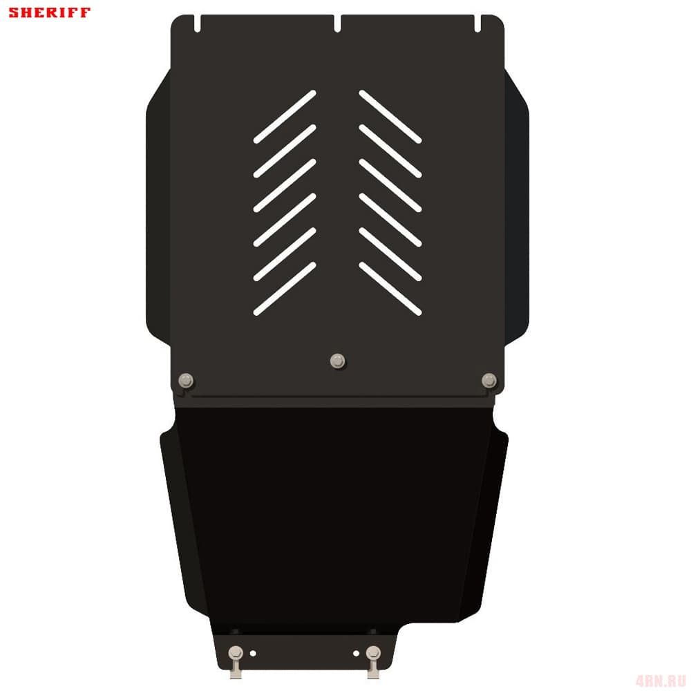 Защита картера Sheriff нужна для сохранности узлов и агрегатов, находящихся на днище авто. Она надежно защитит двигательный отсек вашей машины от повреждений. Также она защищает моторный отсек от влаги, грязи, и предусматривает наличие металлических крыльев, которые выполняют функцию пыльника.