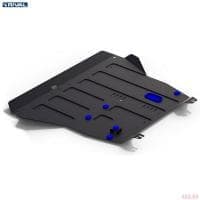 Порошковое окрашивание гарантирует долгий срок службы. А глубокий штамп увеличивает жесткость до 2,5 раз. Также имеется утопленный крепеж для предотвращения срывов. Качественная покраска защиты картера выдерживает 720 часов соляного тумана. Толщина изделия составляет 2-6 мм. Подштамповка в местах крепления предохраняет крепеж от срезания. Деталь спроектирована индивидуально для вашего автомобиля, что позволяет устанавливать ее в штатные места без доработки кузова за 10 мин.