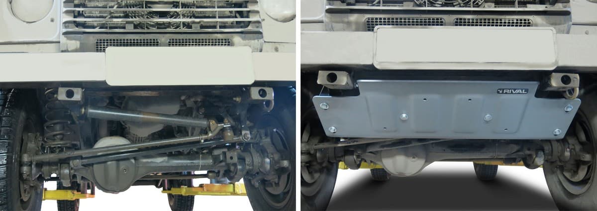 Защита Rival произведена из высококачественного алюминия. Она надежно предохраняет днище вашего автомобиля от различных повреждений при наезде на бордюры, выступающие канализационные люки, кромки поврежденного асфальта или при ремонте дорог.