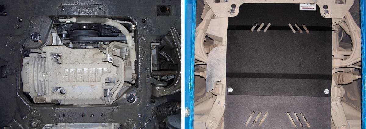 Порошковое окрашивание гарантирует долгий срок службы. А глубокий штамп увеличивает жесткость до 2,5 раз. Также имеется утопленный крепеж для предотвращения срывов. Качественная покраска защиты картера выдерживает 720 часов соляного тумана. Толщина изделия составляет 2-6 мм. Подштамповка в местах крепления предохраняет крепеж от срезания. Деталь спроектирована индивидуально для вашего автомобиля, что позволяет устанавливать ее в штатные места без доработки кузова за 10 мин.