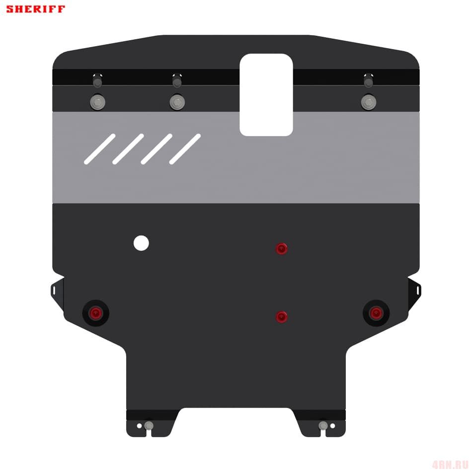 Защита картера Sheriff нужна для сохранности узлов и агрегатов, находящихся на днище авто. Она надежно защитит двигательный отсек вашей машины от повреждений. Также она защищает моторный отсек от влаги, грязи, и предусматривает наличие металлических крыльев, которые выполняют функцию пыльника.