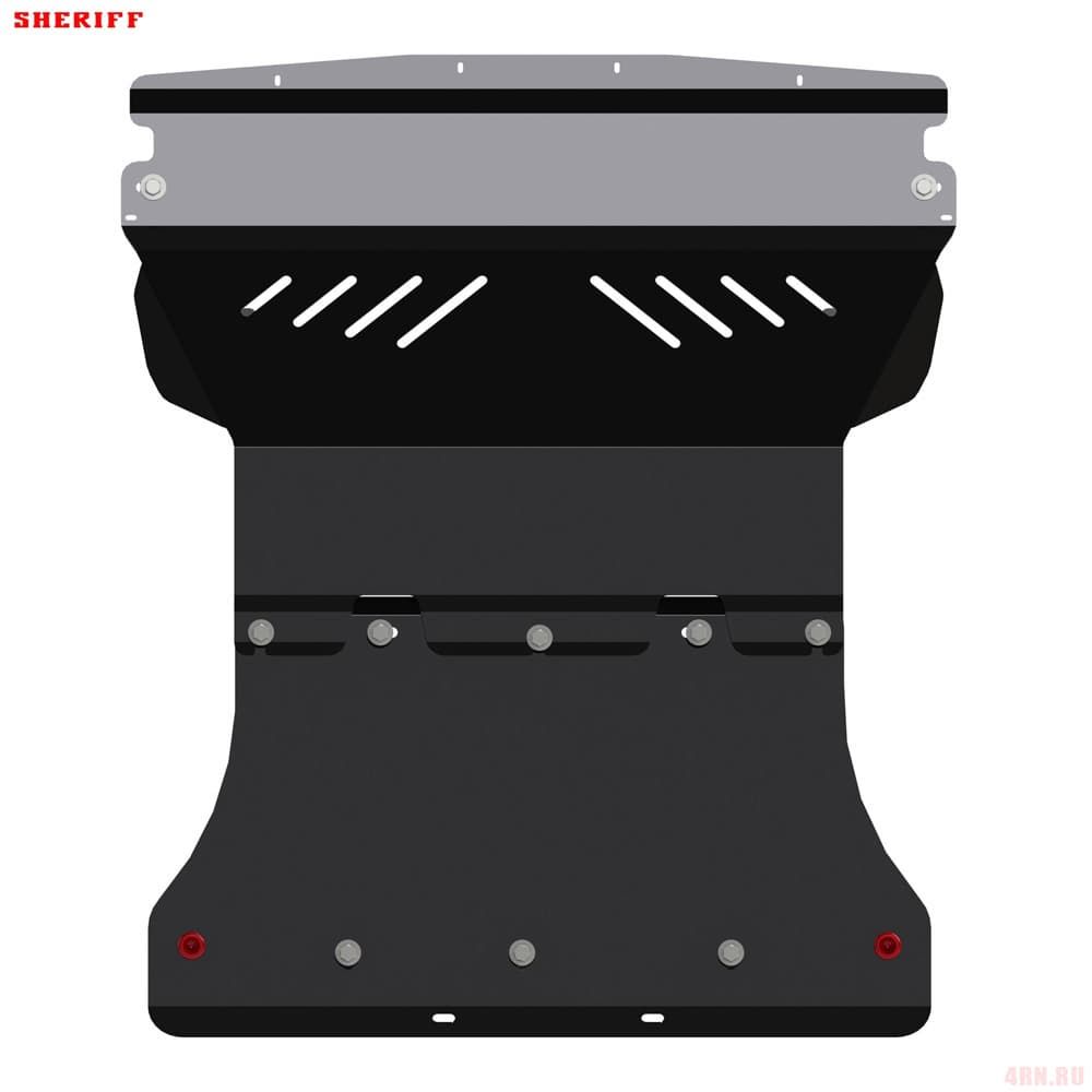Защита картера Sheriff нужна для сохранности узлов и агрегатов, находящихся на днище авто. Она надежно защитит двигательный отсек вашей машины от повреждений. Также она защищает моторный отсек от влаги, грязи, и предусматривает наличие металлических крыльев, которые выполняют функцию пыльника.