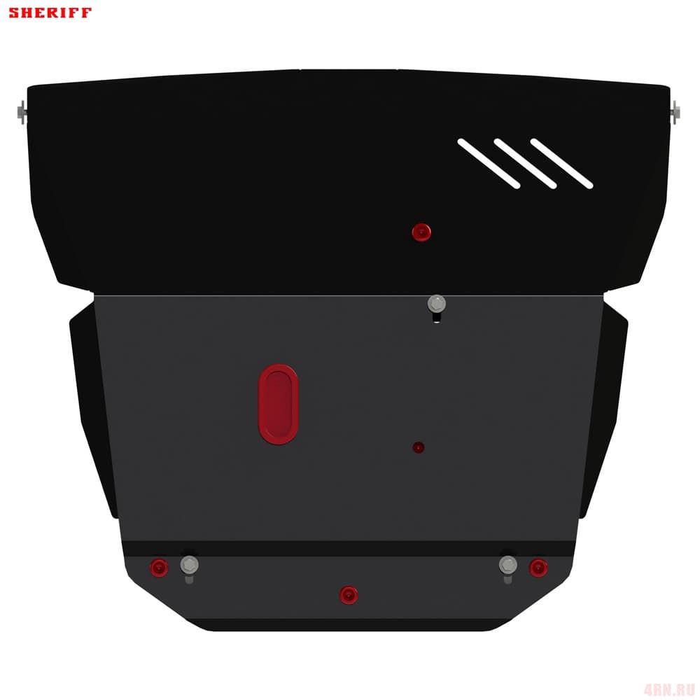 Защита картера Sheriff нужна для сохранности узлов и агрегатов, находящихся на днище авто. Она надежно защитит двигательный отсек вашей машины от повреждений. Также она защищает моторный отсек от влаги, грязи, и предусматривает наличие металлических крыльев, которые выполняют функцию пыльника.