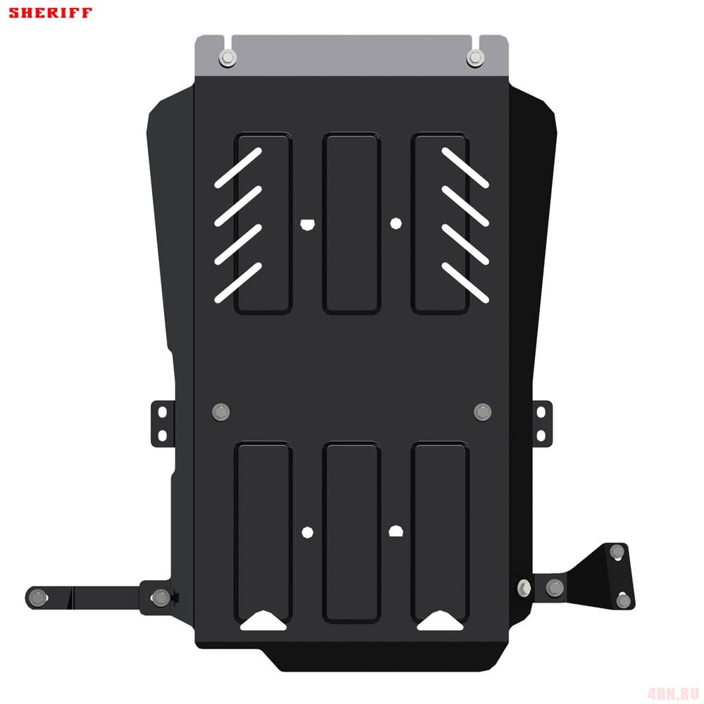 Защита картера Sheriff нужна для сохранности узлов и агрегатов, находящихся на днище авто. Она надежно защитит двигательный отсек вашей машины от повреждений. Также она защищает моторный отсек от влаги, грязи, и предусматривает наличие металлических крыльев, которые выполняют функцию пыльника.