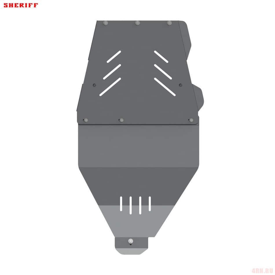 Защита картера Sheriff нужна для сохранности узлов и агрегатов, находящихся на днище авто. Она надежно защитит двигательный отсек вашего автомобиля от повреждений. Также она защищает моторный отсек от влаги и грязи, и предусматривает наличие металлических крыльев, которые выполняют функцию пыльника.