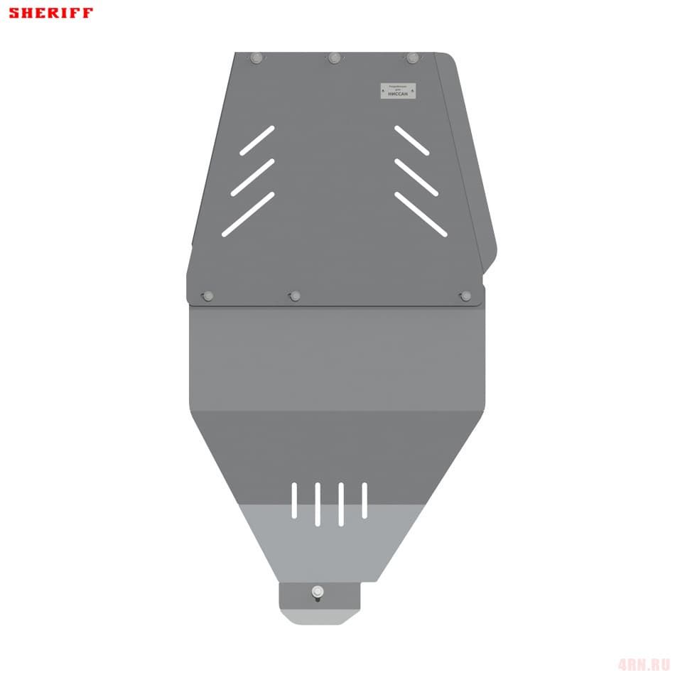 Алюминиевая защита кпп, раздаточной коробки с крепежом в комплекте, артикул 15.0760 от российского производителя Шериф. Разработана специально для автомобиля Nissan Pathfinder 2005-2014.