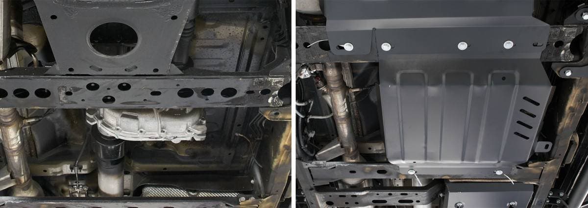 Порошковое окрашивание гарантирует долгий срок службы. А глубокий штамп увеличивает жесткость до 2,5 раз. Также имеется утопленный крепеж для предотвращения срывов. Качественная покраска защиты картера выдерживает 720 часов соляного тумана. Толщина изделия составляет 2-6 мм. Подштамповка в местах крепления предохраняет крепеж от срезания. Деталь спроектирована индивидуально для вашего автомобиля, что позволяет устанавливать ее в штатные места без доработки кузова за 10 мин.