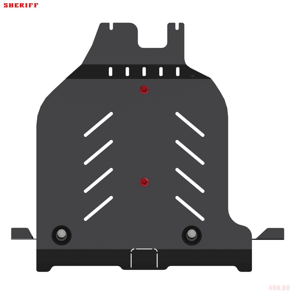 Защита картера Sheriff нужна для сохранности узлов и агрегатов, находящихся на днище авто. Она надежно защитит двигательный отсек вашей машины от повреждений. Также она защищает моторный отсек от влаги, грязи, и предусматривает наличие металлических крыльев, которые выполняют функцию пыльника.