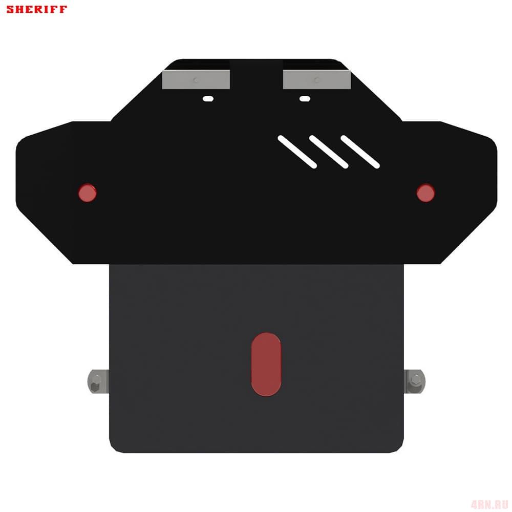 Защита картера Sheriff нужна для сохранности узлов и агрегатов, находящихся на днище авто. Она надежно защитит двигательный отсек вашей машины от повреждений. Также она защищает моторный отсек от влаги, грязи, и предусматривает наличие металлических крыльев, которые выполняют функцию пыльника.