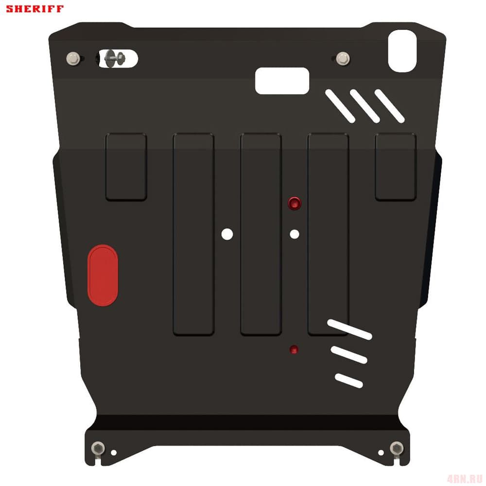 Защита картера Sheriff нужна для сохранности узлов и агрегатов, находящихся на днище авто. Она надежно защитит двигательный отсек вашей машины от повреждений. Также она защищает моторный отсек от влаги, грязи, и предусматривает наличие металлических крыльев, которые выполняют функцию пыльника.