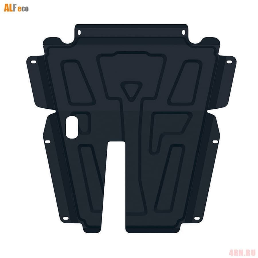 Защита для двигателя и кпп от производителя ALFeco, состоит из 1 листа и крепежа, материал - сталь толщиной 2.0 мм, подходит для автомобилей с двигателем объемом - все, привод - все, кпп - все. Отверстие для слива масла и смены фильтра - нет.