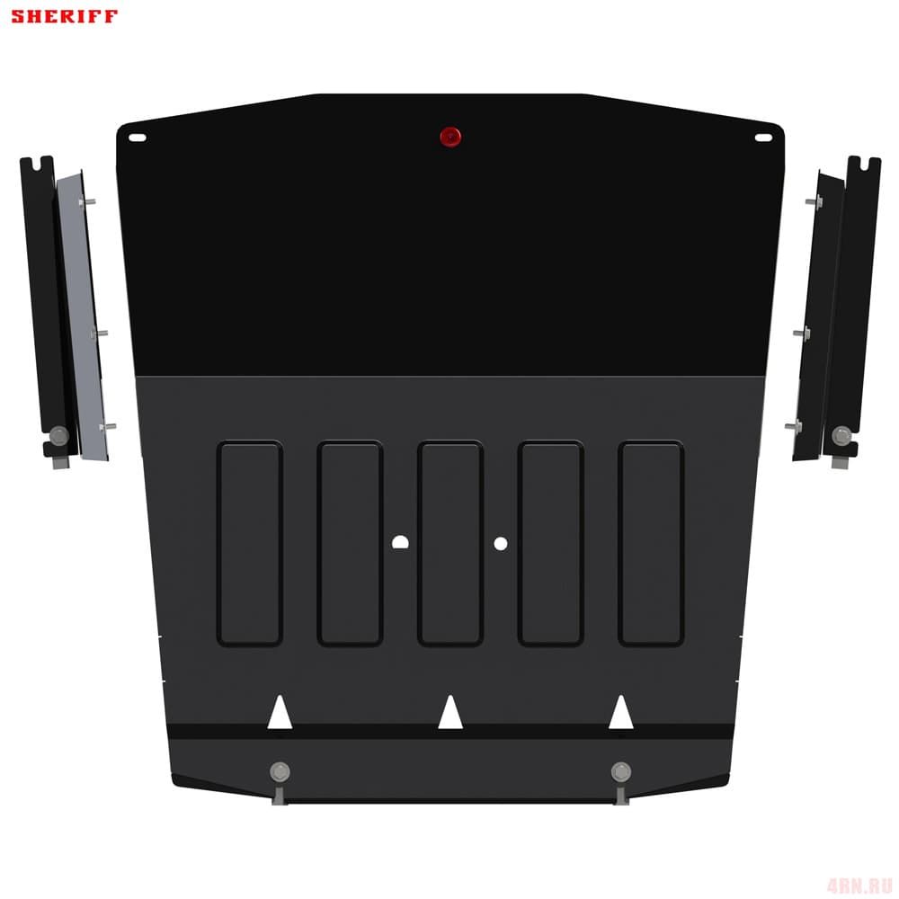 Защита картера Sheriff нужна для сохранности узлов и агрегатов, находящихся на днище авто. Она надежно защитит двигательный отсек вашей машины от повреждений. Также она защищает моторный отсек от влаги, грязи, и предусматривает наличие металлических крыльев, которые выполняют функцию пыльника.
