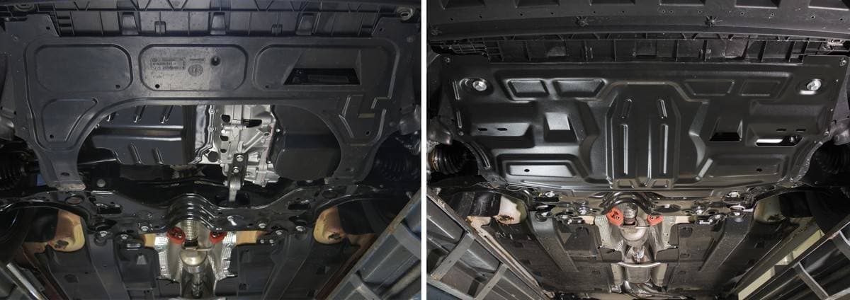 Порошковое окрашивание гарантирует долгий срок службы. А глубокий штамп увеличивает жесткость до 2,5 раз. Также имеется утопленный крепеж для предотвращения срывов. Качественная покраска защиты картера выдерживает 720 часов соляного тумана. Толщина изделия составляет 2-6 мм. Подштамповка в местах крепления предохраняет крепеж от срезания. Деталь спроектирована индивидуально для вашего автомобиля, что позволяет устанавливать ее в штатные места без доработки кузова за 10 мин.