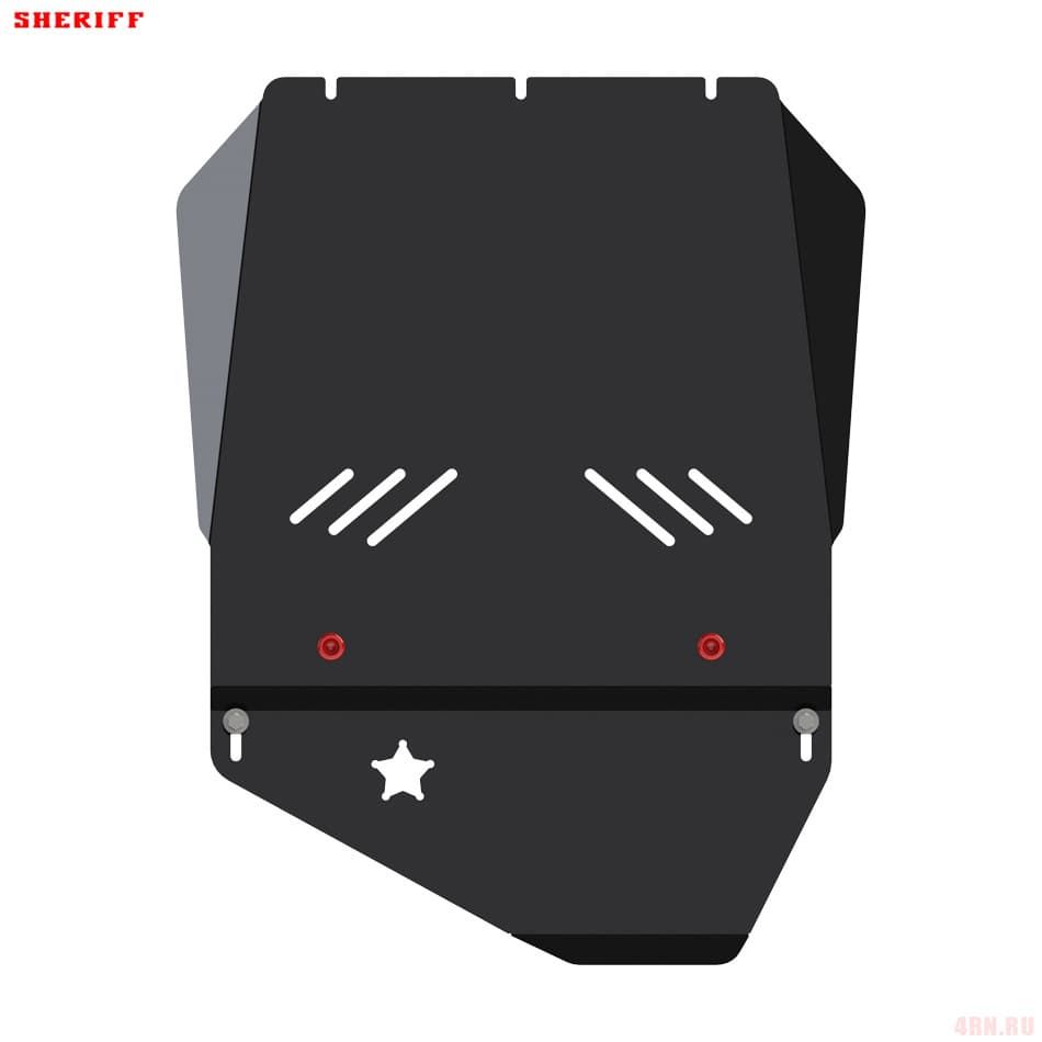 Защита картера Sheriff нужна для сохранности узлов и агрегатов, находящихся на днище авто. Она надежно защитит двигательный отсек вашей машины от повреждений. Также она защищает моторный отсек от влаги, грязи, и предусматривает наличие металлических крыльев, которые выполняют функцию пыльника.