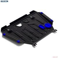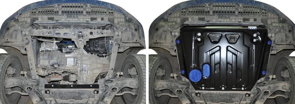 Порошковое окрашивание гарантирует долгий срок службы. А глубокий штамп увеличивает жесткость до 2,5 раз. Также имеется утопленный крепеж для предотвращения срывов. Качественная покраска защиты картера выдерживает 720 часов соляного тумана. Толщина изделия составляет 2-6 мм. Подштамповка в местах крепления предохраняет крепеж от срезания. Деталь спроектирована индивидуально для вашего автомобиля, что позволяет устанавливать ее в штатные места без доработки кузова за 10 мин.