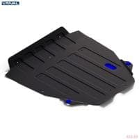 Порошковое окрашивание гарантирует долгий срок службы. А глубокий штамп увеличивает жесткость до 2,5 раз. Также имеется утопленный крепеж для предотвращения срывов. Качественная покраска защиты картера выдерживает 720 часов соляного тумана. Толщина изделия составляет 2-6 мм. Подштамповка в местах крепления предохраняет крепеж от срезания. Деталь спроектирована индивидуально для вашего автомобиля, что позволяет устанавливать ее в штатные места без доработки кузова за 10 мин.