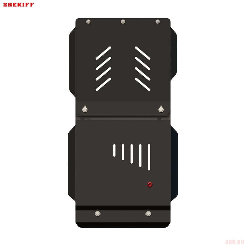 Защита картера Sheriff нужна для сохранности узлов и агрегатов, находящихся на днище авто. Она надежно защитит двигательный отсек вашей машины от повреждений. Также она защищает моторный отсек от влаги, грязи, и предусматривает наличие металлических крыльев, которые выполняют функцию пыльника.