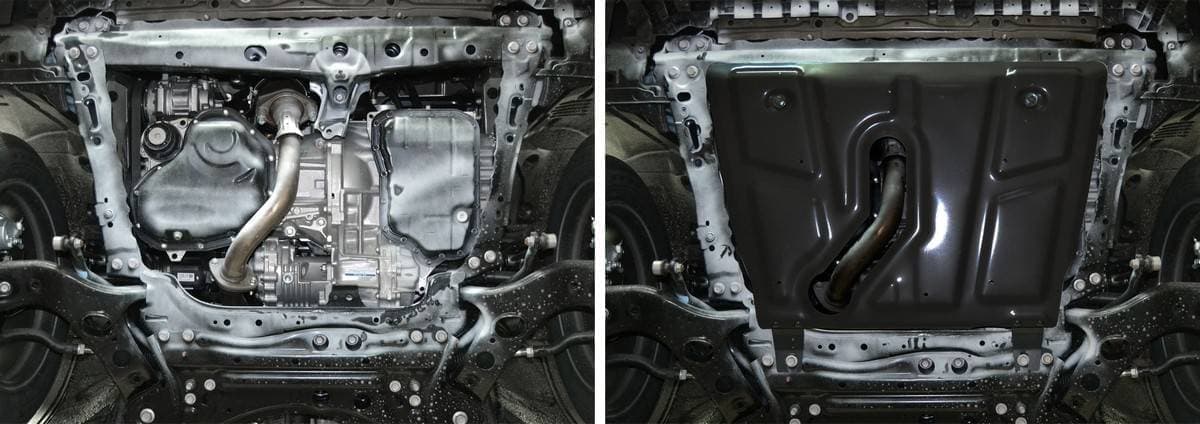 Порошковое окрашивание гарантирует долгий срок службы. А глубокий штамп увеличивает жесткость до 2,5 раз. Также имеется утопленный крепеж для предотвращения срывов. Качественная покраска защиты картера выдерживает 720 часов соляного тумана. Толщина изделия составляет 2-6 мм. Подштамповка в местах крепления предохраняет крепеж от срезания. Деталь спроектирована индивидуально для вашего автомобиля, что позволяет устанавливать ее в штатные места без доработки кузова за 10 мин.