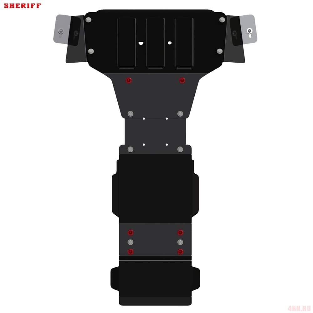 Защита картера Sheriff нужна для сохранности узлов и агрегатов, находящихся на днище авто. Она надежно защитит двигательный отсек вашей машины от повреждений. Также она защищает моторный отсек от влаги, грязи, и предусматривает наличие металлических крыльев, которые выполняют функцию пыльника.