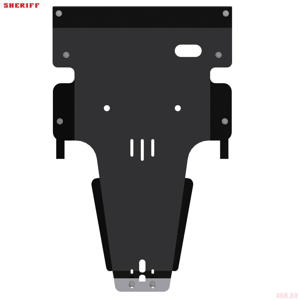 Защита картера Sheriff нужна для сохранности узлов и агрегатов, находящихся на днище авто. Она надежно защитит двигательный отсек вашей машины от повреждений. Также она защищает моторный отсек от влаги, грязи, и предусматривает наличие металлических крыльев, которые выполняют функцию пыльника.