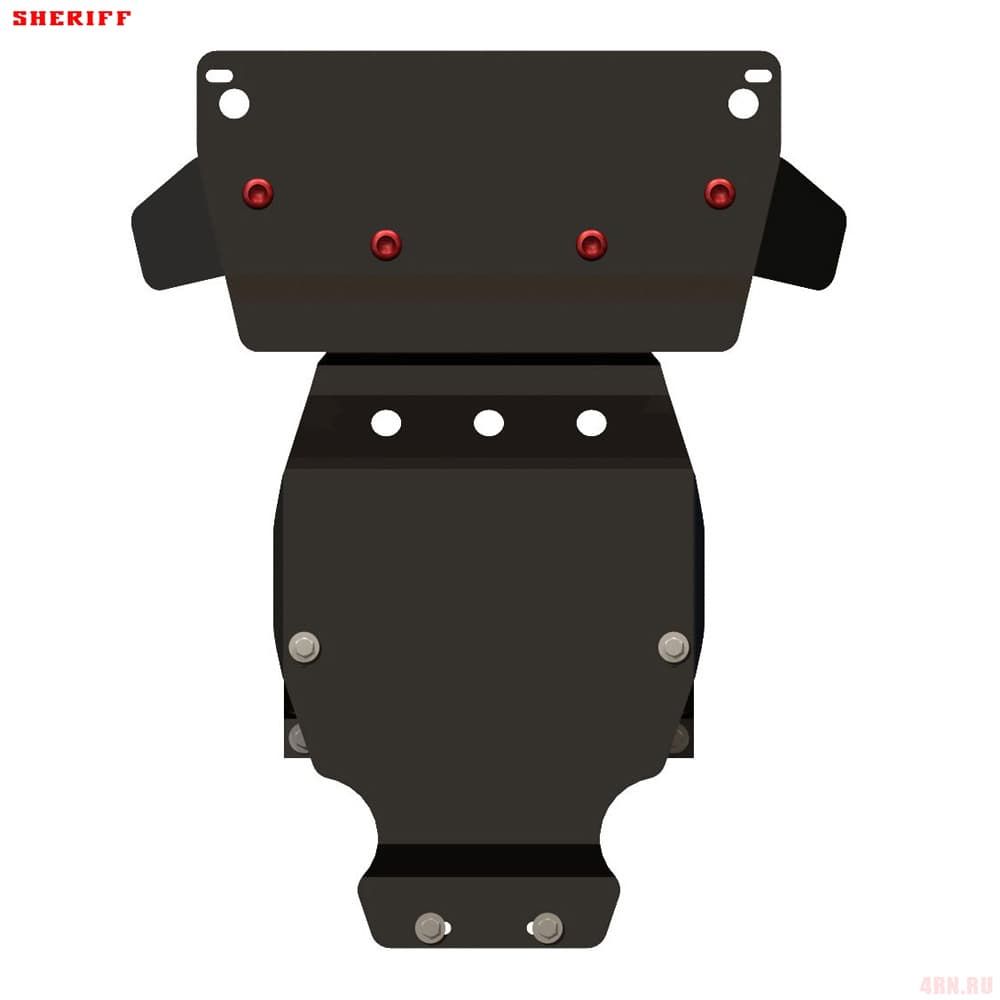 Защита картера Sheriff нужна для сохранности узлов и агрегатов, находящихся на днище авто. Она надежно защитит двигательный отсек вашей машины от повреждений. Также она защищает моторный отсек от влаги, грязи, и предусматривает наличие металлических крыльев, которые выполняют функцию пыльника.
