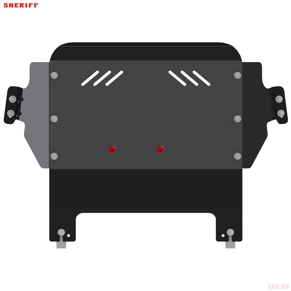 Защита картера Sheriff нужна для сохранности узлов и агрегатов, находящихся на днище авто. Она надежно защитит двигательный отсек вашей машины от повреждений. Также она защищает моторный отсек от влаги, грязи, и предусматривает наличие металлических крыльев, которые выполняют функцию пыльника.