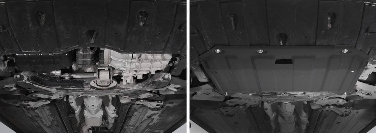 Порошковое окрашивание гарантирует долгий срок службы. А глубокий штамп увеличивает жесткость до 2,5 раз. Также имеется утопленный крепеж для предотвращения срывов. Качественная покраска защиты картера выдерживает 720 часов соляного тумана. Толщина изделия составляет 2-6 мм. Подштамповка в местах крепления предохраняет крепеж от срезания. Деталь спроектирована индивидуально для вашего автомобиля, что позволяет устанавливать ее в штатные места без доработки кузова за 10 мин.