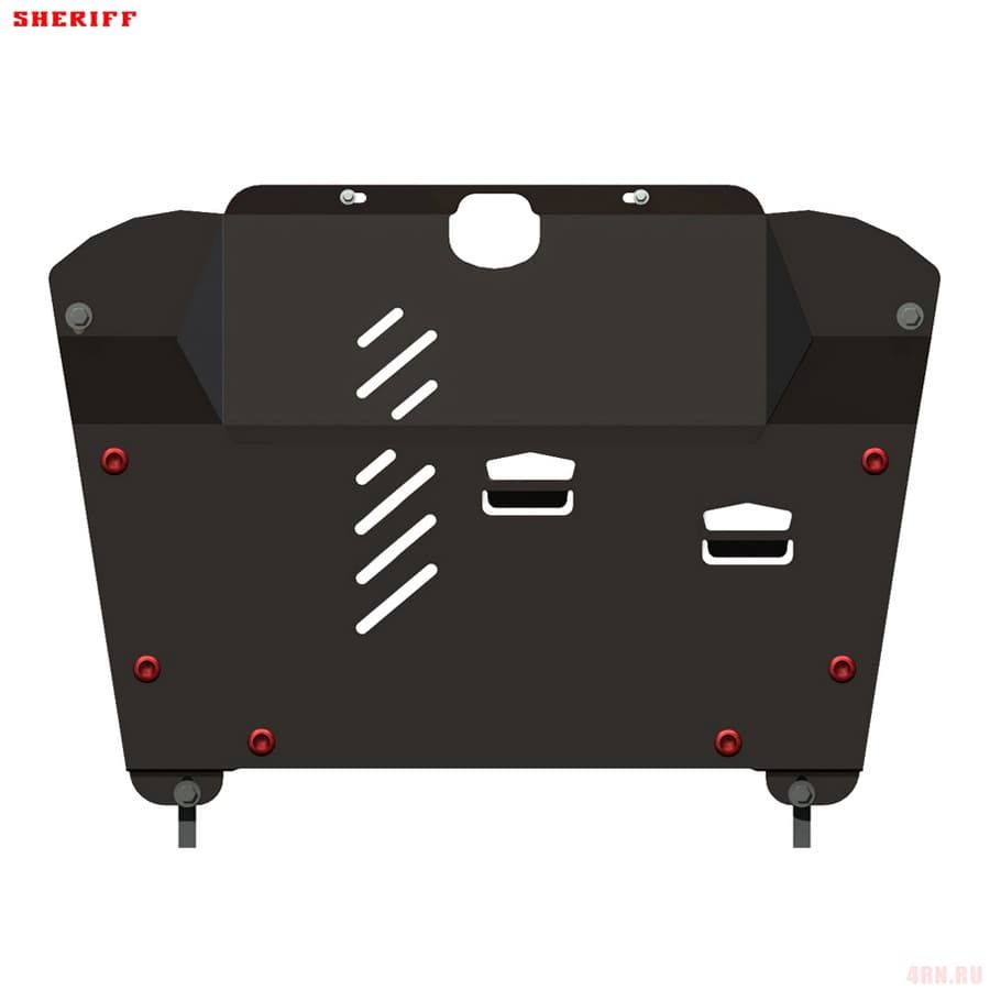 Защита картера Sheriff нужна для сохранности узлов и агрегатов, находящихся на днище авто. Она надежно защитит двигательный отсек вашей машины от повреждений. Также она защищает моторный отсек от влаги, грязи, и предусматривает наличие металлических крыльев, которые выполняют функцию пыльника.