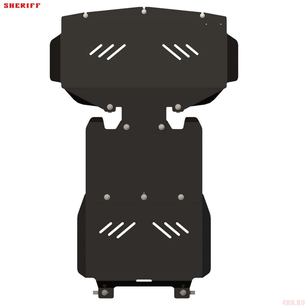 Защита картера Sheriff нужна для сохранности узлов и агрегатов, находящихся на днище авто. Она надежно защитит двигательный отсек вашей машины от повреждений. Также она защищает моторный отсек от влаги, грязи, и предусматривает наличие металлических крыльев, которые выполняют функцию пыльника.