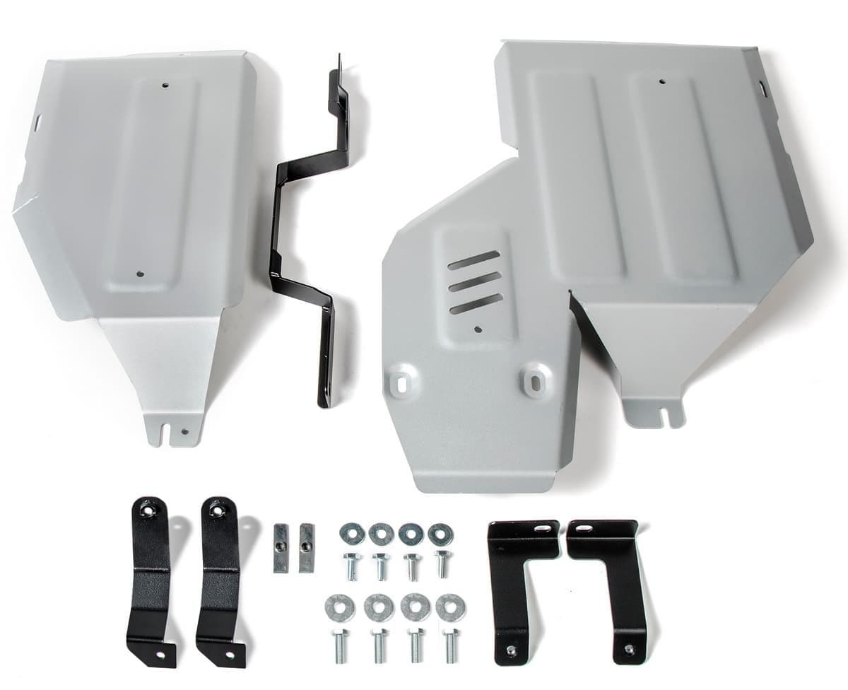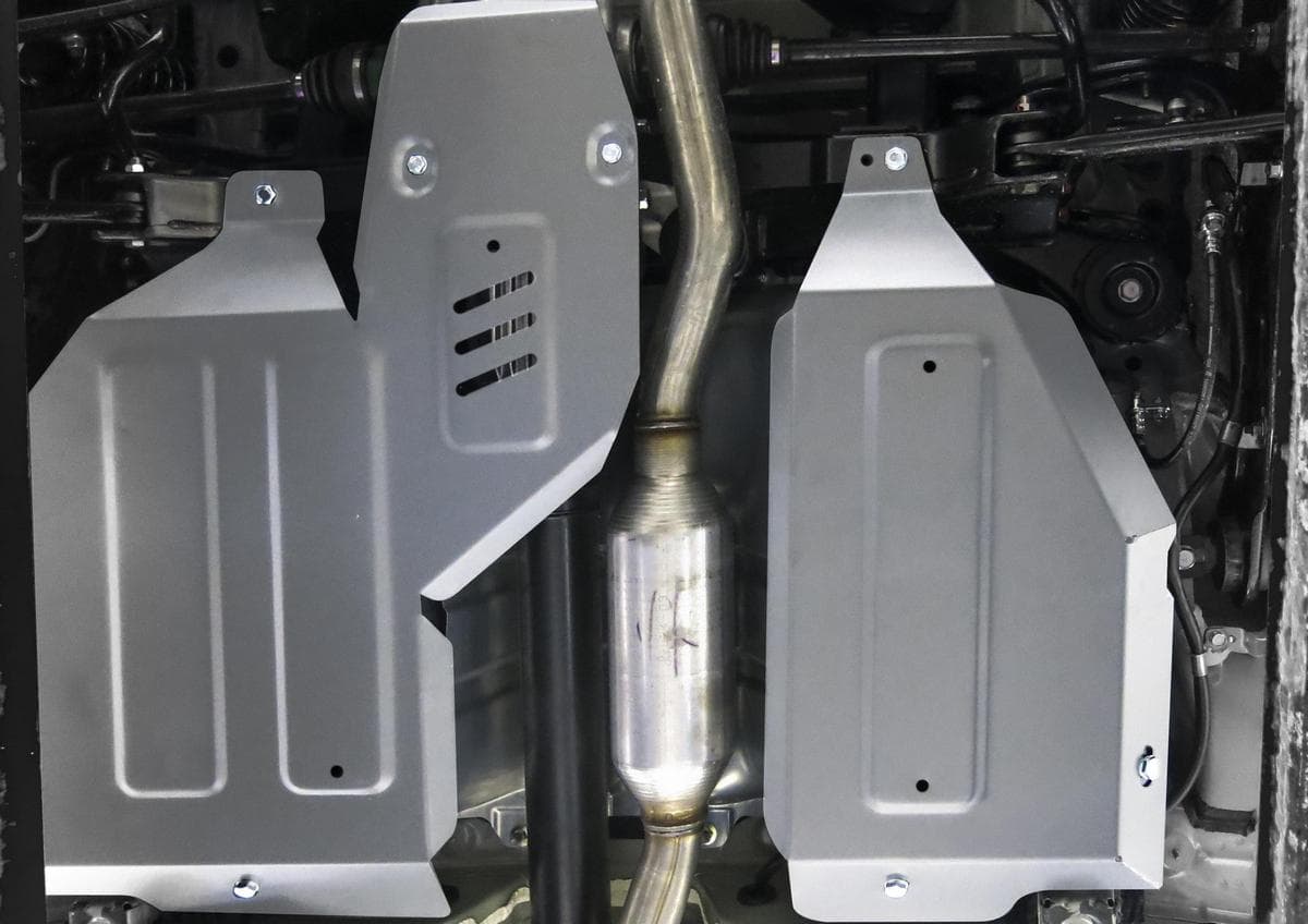 Стойкое порошковое окрашивание позволяет сохранить внешний вид, защитит от царапин, предотвратит коррозию. Также имеется утопленный крепеж для предотвращения срывов. Крепеж не образует с алюминием гальваническую пару. Защита спроектирована индивидуально для автомобиля, что позволяет устанавливать ее в штатные места без доработки кузова за 10 мин.