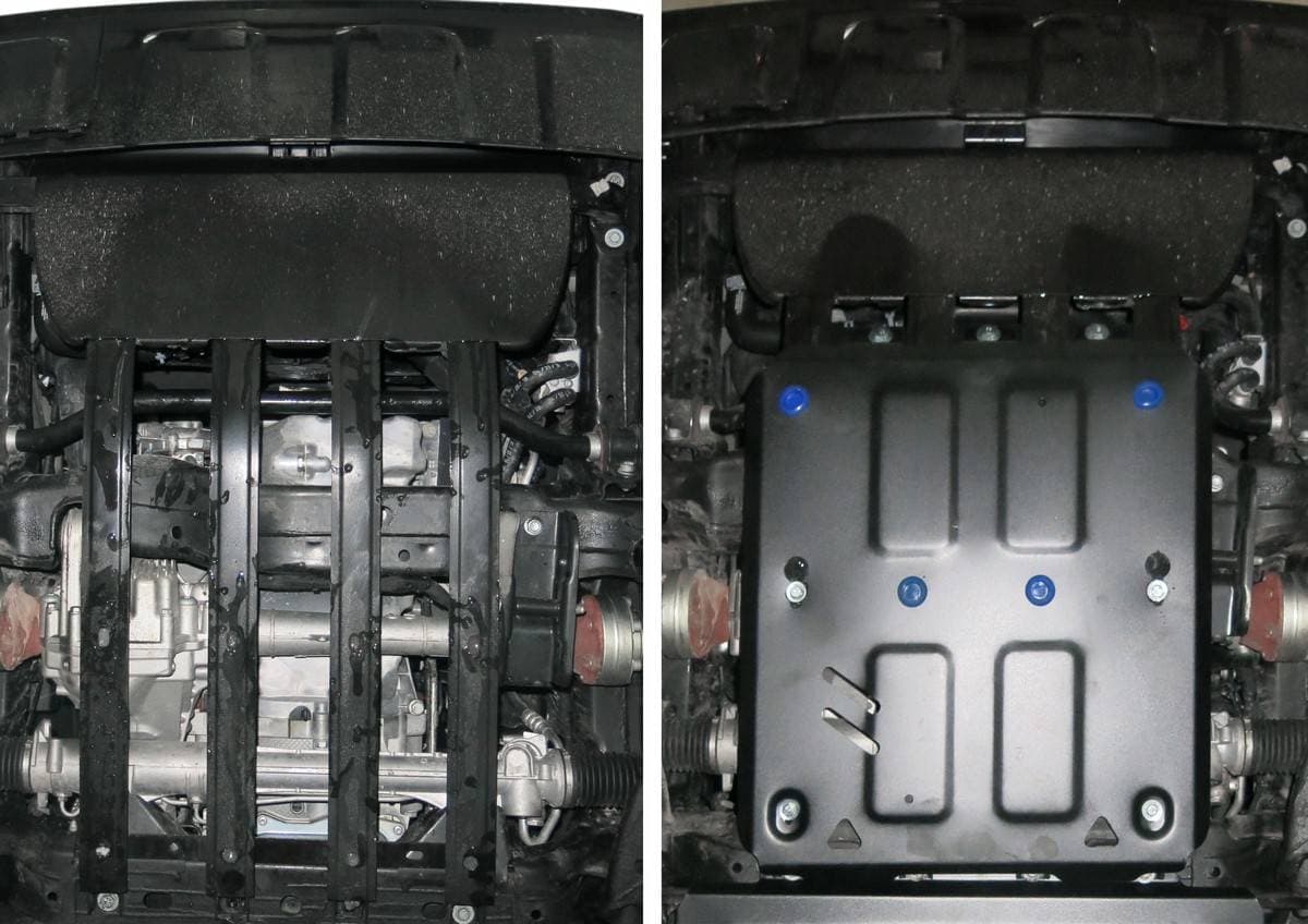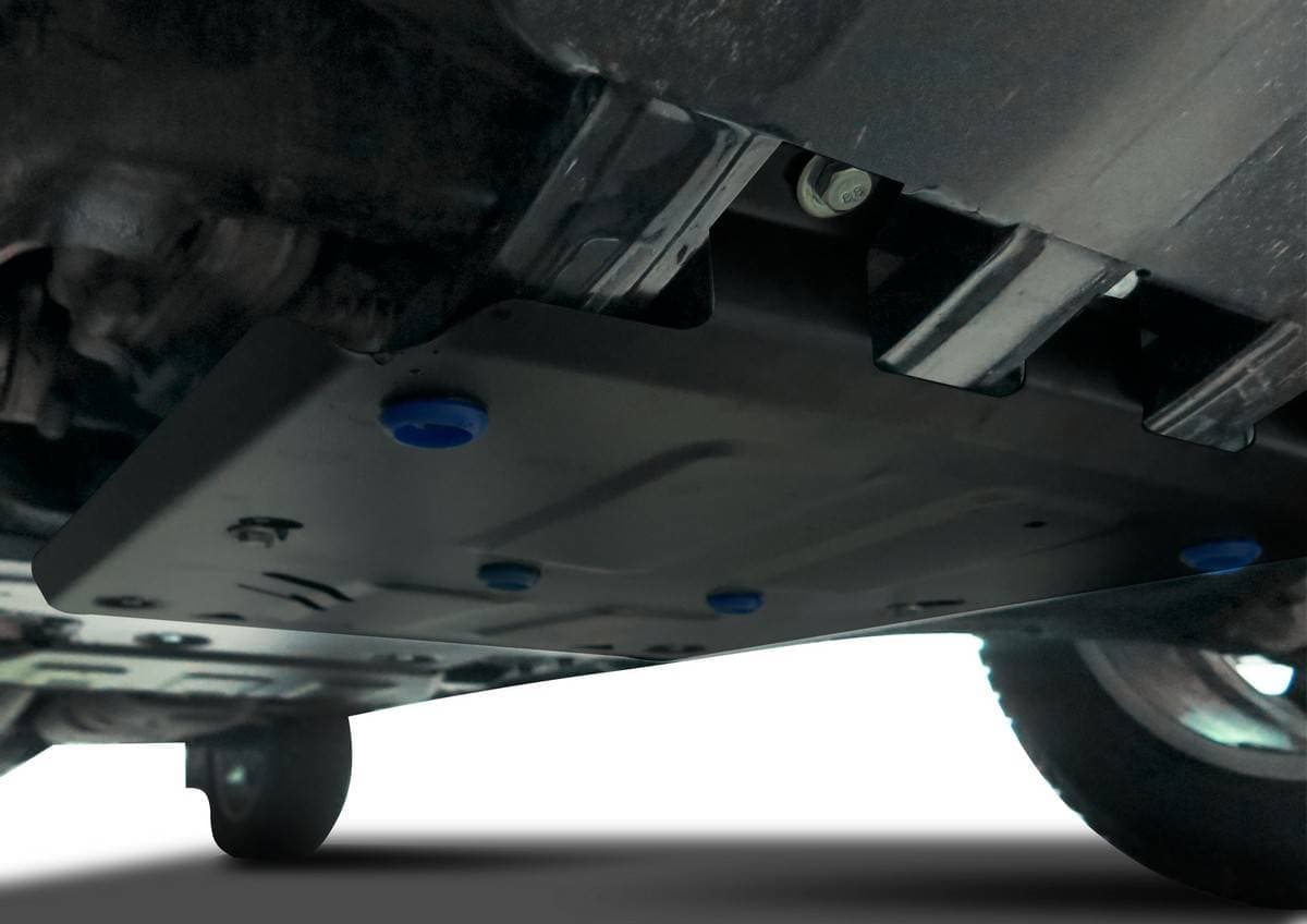 Порошковое окрашивание гарантирует долгий срок службы. А глубокий штамп увеличивает жесткость до 2,5 раз. Также имеется утопленный крепеж для предотвращения срывов. Качественная покраска защиты картера выдерживает 720 часов соляного тумана. Толщина изделия составляет 2-6 мм. Подштамповка в местах крепления предохраняет крепеж от срезания. Деталь спроектирована индивидуально для вашего автомобиля, что позволяет устанавливать ее в штатные места без доработки кузова за 10 мин.