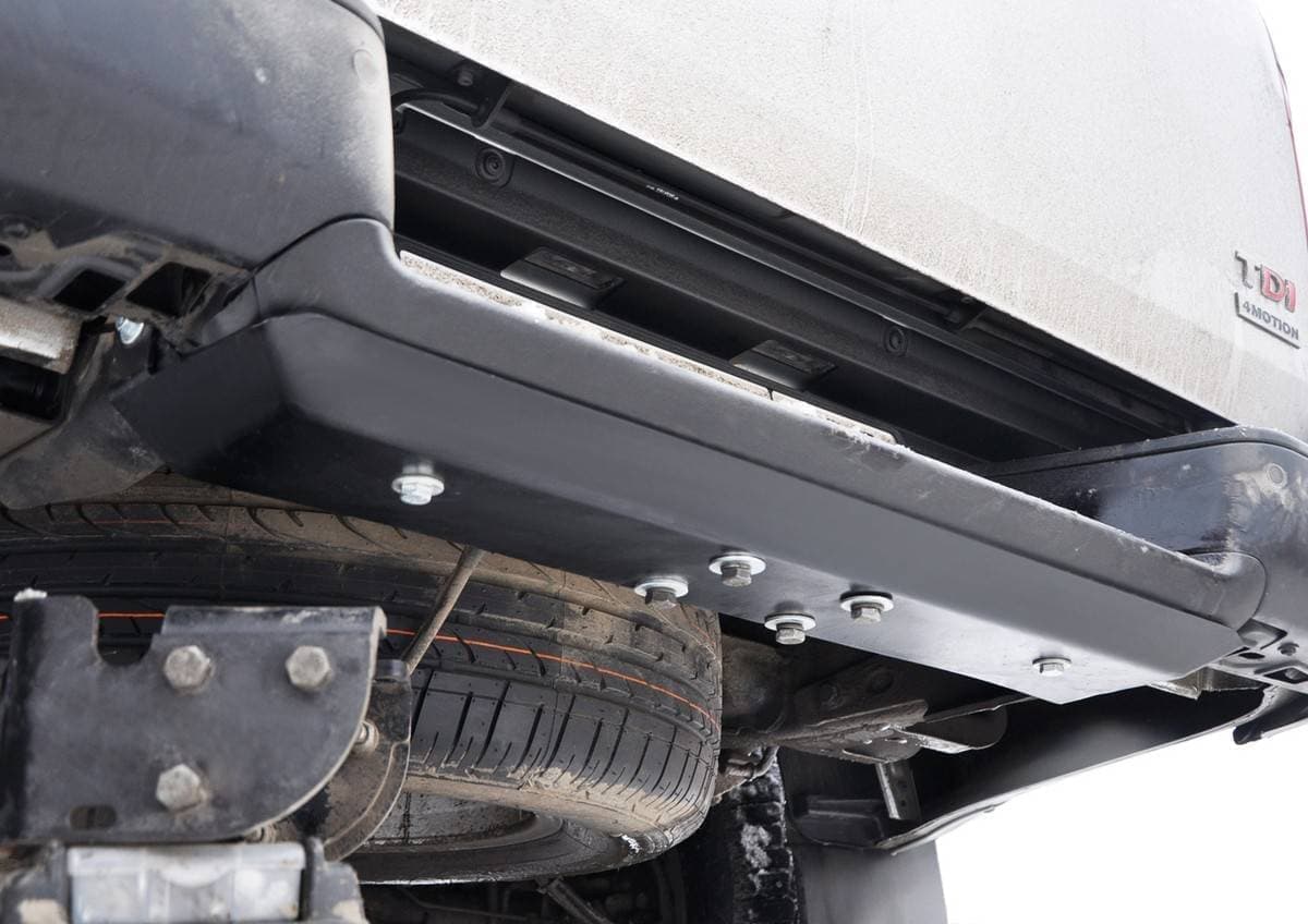 Порошковое окрашивание гарантирует долгий срок службы. А глубокий штамп увеличивает жесткость до 2,5 раз. Также имеется утопленный крепеж для предотвращения срывов. Качественная покраска защиты картера выдерживает 720 часов соляного тумана. Толщина изделия составляет 2-6 мм. Подштамповка в местах крепления предохраняет крепеж от срезания. Деталь спроектирована индивидуально для вашего автомобиля, что позволяет устанавливать ее в штатные места без доработки кузова за 10 мин.
