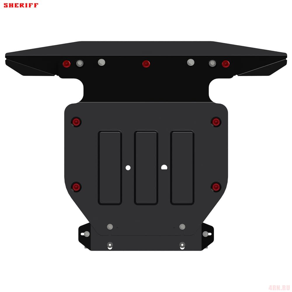 Защита картера Sheriff нужна для сохранности узлов и агрегатов, находящихся на днище авто. Она надежно защитит двигательный отсек вашей машины от повреждений. Также она защищает моторный отсек от влаги, грязи, и предусматривает наличие металлических крыльев, которые выполняют функцию пыльника.
