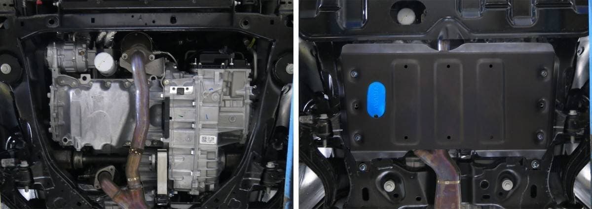 Порошковое окрашивание гарантирует долгий срок службы. А глубокий штамп увеличивает жесткость до 2,5 раз. Также имеется утопленный крепеж для предотвращения срывов. Качественная покраска защиты картера выдерживает 720 часов соляного тумана. Толщина изделия составляет 2-6 мм. Подштамповка в местах крепления предохраняет крепеж от срезания. Деталь спроектирована индивидуально для вашего автомобиля, что позволяет устанавливать ее в штатные места без доработки кузова за 10 мин.