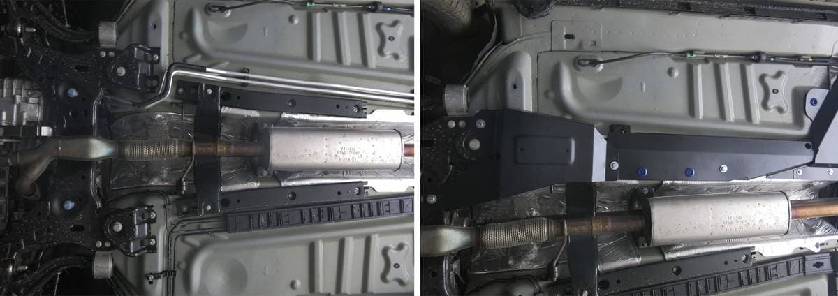 Порошковое окрашивание гарантирует долгий срок службы. А глубокий штамп увеличивает жесткость до 2,5 раз. Также имеется утопленный крепеж для предотвращения срывов. Качественная покраска защиты картера выдерживает 720 часов соляного тумана. Толщина изделия составляет 2-6 мм. Подштамповка в местах крепления предохраняет крепеж от срезания. Деталь спроектирована индивидуально для вашего автомобиля, что позволяет устанавливать ее в штатные места без доработки кузова за 10 мин.