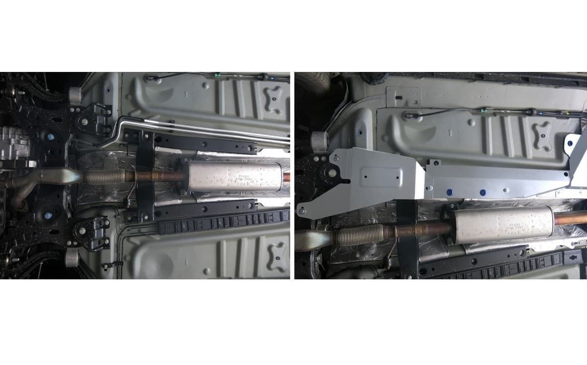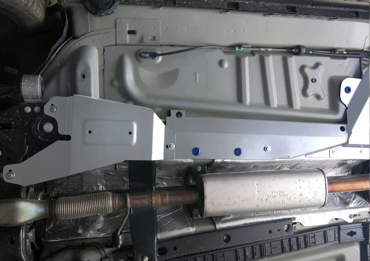 Стойкое порошковое окрашивание позволяет сохранить внешний вид, защитит от царапин, предотвратит коррозию. Также имеется утопленный крепеж для предотвращения срывов. Крепеж не образует с алюминием гальваническую пару. Защита спроектирована индивидуально для автомобиля, что позволяет устанавливать ее в штатные места без доработки кузова за 10 мин.
