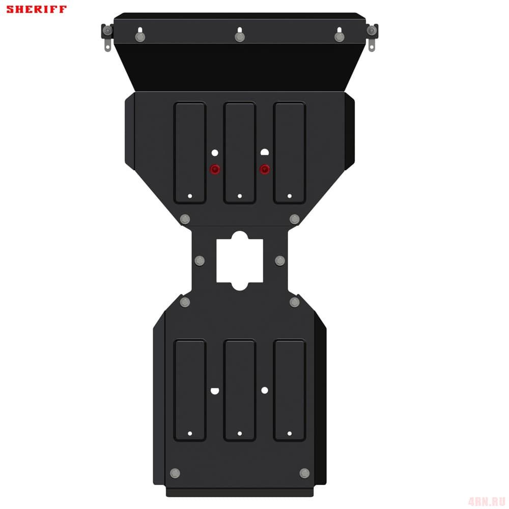 Защита картера Sheriff нужна для сохранности узлов и агрегатов, находящихся на днище авто. Она надежно защитит двигательный отсек вашей машины от повреждений. Также она защищает моторный отсек от влаги, грязи, и предусматривает наличие металлических крыльев, которые выполняют функцию пыльника.