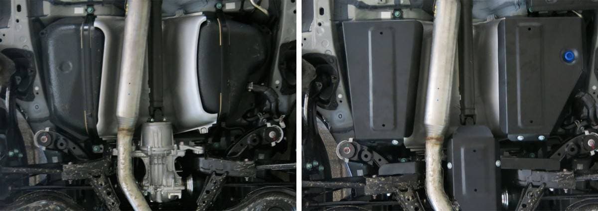 Порошковое окрашивание гарантирует долгий срок службы. А глубокий штамп увеличивает жесткость до 2,5 раз. Также имеется утопленный крепеж для предотвращения срывов. Качественная покраска защиты картера выдерживает 720 часов соляного тумана. Толщина изделия составляет 2-6 мм. Подштамповка в местах крепления предохраняет крепеж от срезания. Деталь спроектирована индивидуально для вашего автомобиля, что позволяет устанавливать ее в штатные места без доработки кузова за 10 мин.