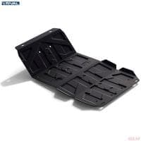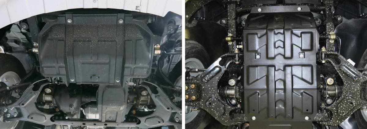 Порошковое окрашивание гарантирует долгий срок службы. А глубокий штамп увеличивает жесткость до 2,5 раз. Также имеется утопленный крепеж для предотвращения срывов. Качественная покраска защиты картера выдерживает 720 часов соляного тумана. Толщина изделия составляет 2-6 мм. Подштамповка в местах крепления предохраняет крепеж от срезания. Деталь спроектирована индивидуально для вашего автомобиля, что позволяет устанавливать ее в штатные места без доработки кузова за 10 мин.