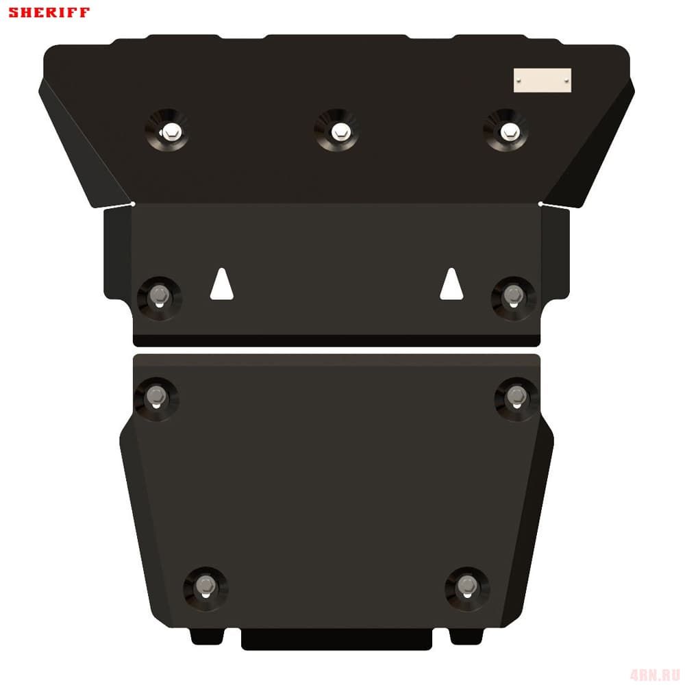Защита картера Sheriff нужна для сохранности узлов и агрегатов, находящихся на днище авто. Она надежно защитит двигательный отсек вашей машины от повреждений. Также она защищает моторный отсек от влаги, грязи, и предусматривает наличие металлических крыльев, которые выполняют функцию пыльника.