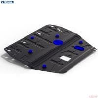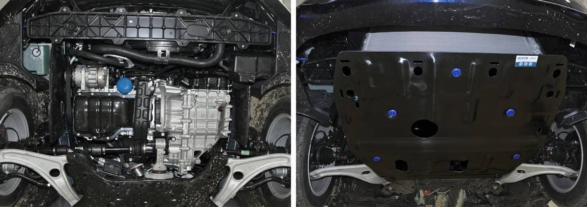 Порошковое окрашивание гарантирует долгий срок службы. А глубокий штамп увеличивает жесткость до 2,5 раз. Также имеется утопленный крепеж для предотвращения срывов. Качественная покраска защиты картера выдерживает 720 часов соляного тумана. Толщина изделия составляет 2-6 мм. Подштамповка в местах крепления предохраняет крепеж от срезания. Деталь спроектирована индивидуально для вашего автомобиля, что позволяет устанавливать ее в штатные места без доработки кузова за 10 мин.